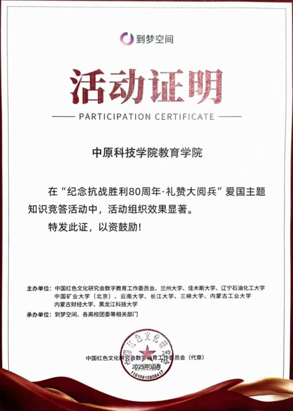 为纪念中国人民抗日战争暨世界反法西斯战争胜利80周年,弘扬爱国主义精神,深化思政育人实效,教育学院组织全体学生参加了“纪念抗战胜利80周年·礼赞大阅兵”爱国主题知识竞答活动。该活动由中国红色文化研究会数字教育工作委员会主办,到梦空间与全国高校联合承办。